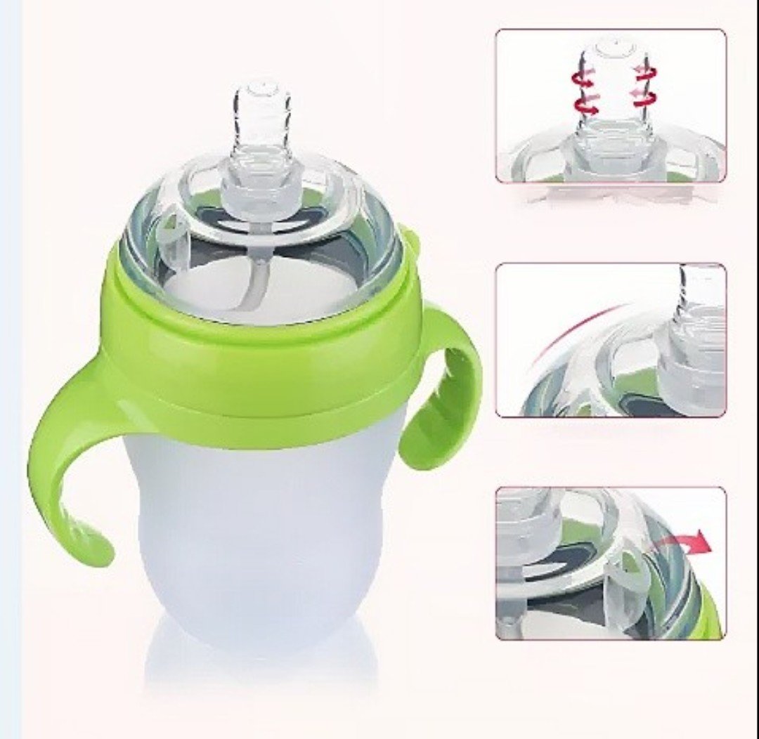 - Bình sữa SILICONE GOLD 150 Ml có tay cầm cổ rộng dễ dàng pha sữa và làm sạch mà không cần đến chổi cọ.